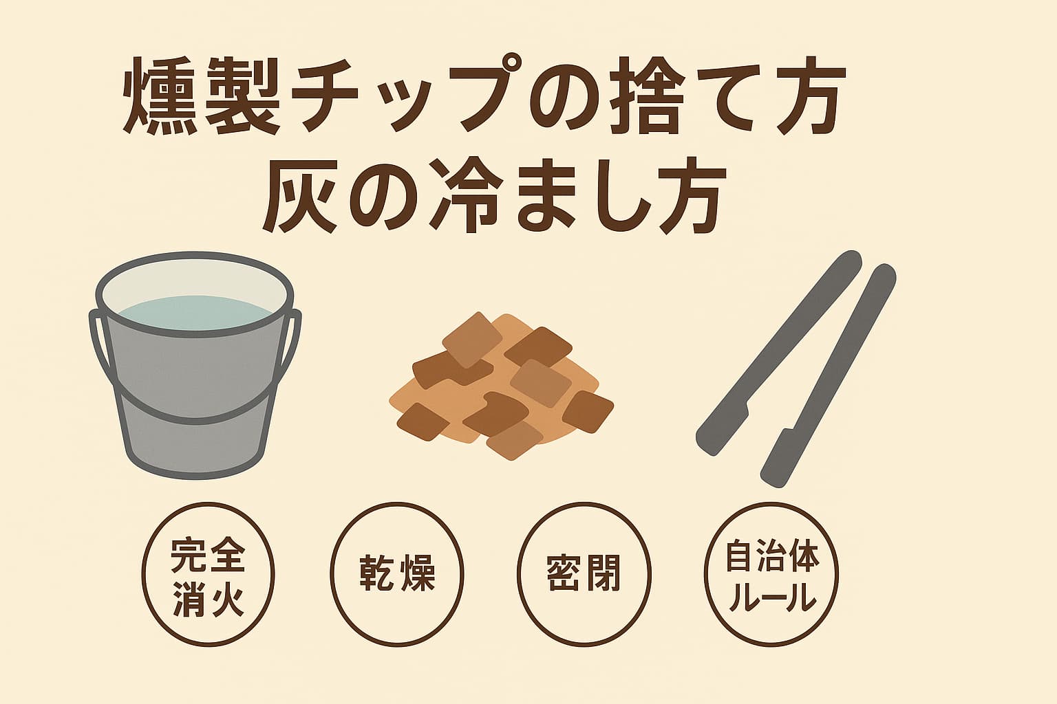 たったこれだけ。けれど、順番どおりに完走することが、最大の安全対策であり、いちばんの近隣配慮です。燻製チップの捨て方は、料理の締めくくりであり、暮らしのマナーでもあります。火を眠らせることは、自分の暮らしを守り、誰かの暮らしを思いやること。あなたのキッチンやキャンプサイトで、今日から静かな終わり方が根づきますように。