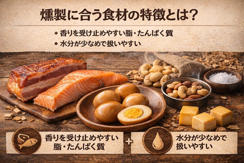 どんな条件で難しくなりやすいのかを先に整理したいなら、燻製にするとまずい食材は?失敗しやすい食材と、おいしくならない理由をやさしく解説も、この段落の延長として読みやすいです。