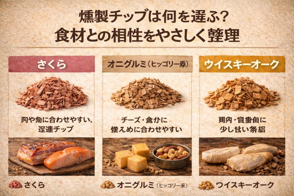 短時間で香りを立てる前提でチップと食材の相性を見たいなら、熱燻製におすすめの食材はこれ|短時間で香りが立つ食材と失敗しない選び方も一緒に読むと、かなり選びやすくなります。