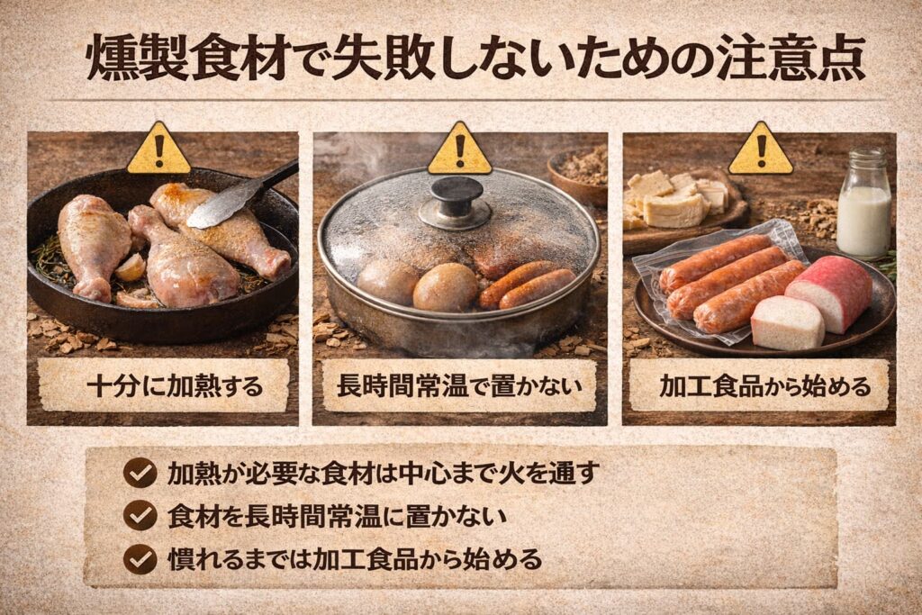 燻製食材で失敗しないためには、加熱が必要なものは中心まで十分に火を通すこと、食材を長時間常温に置かないこと、最初は市販の加工食品から始めることが大切です。妊娠中や体調に不安がある場合は、非加熱で食べる燻製食品にも注意してください。