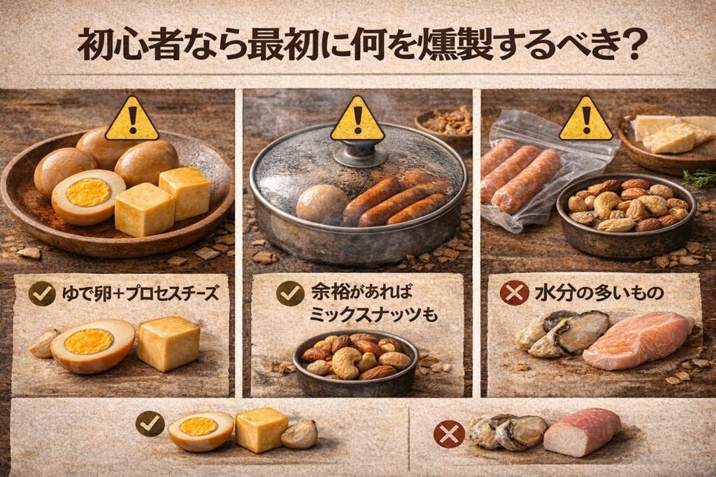 初心者の最初の一回は、ゆで卵+プロセスチーズ、余裕があればミックスナッツを足す組み合わせがおすすめです。反対に、水分が多いものや加熱管理が難しい生肉・生魚は、燻製に慣れてからのほうが安心です。