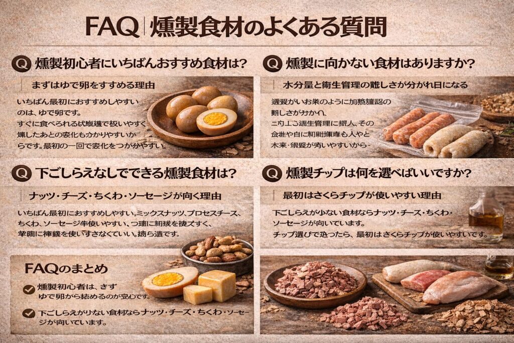 失敗しやすい条件を先に避けたい日は、燻製にするとまずい食材は?失敗しやすい食材と、おいしくならない理由をやさしく解説へ。