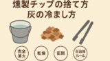 安全面では、直消火はフタで窒息・水掛け禁止、灰は完全消火を目視確認して金属容器へがルール。床は耐熱シートで養生し、可燃物は1m以上離す。道具の片付けまで含めて「料理」です。燻製チップの燃やし方は、技術×マナーの両輪で初めて“おいしい”にたどり着きます。