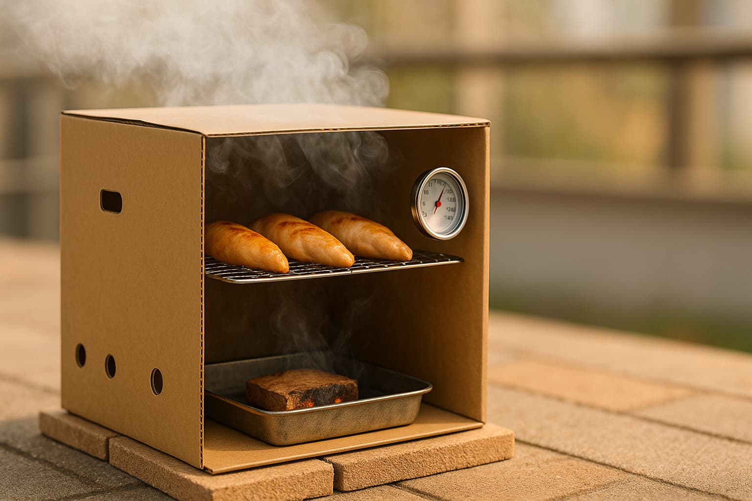 構造はシンプルでも“空気の流れ”だけは譲らない——これがダンボール燻製の鉄則です。箱の下側面に吸気孔(直径1〜2cmを3〜5個)、上面または上側面に排気孔(同程度)を設け、下から上へ薄い白煙が通り抜ける道を作ります。内部は下段=発煙部中段=受け皿上段=食材棚の三層。受け皿で脂やドリップを受け、煙路を汚さないようにします。