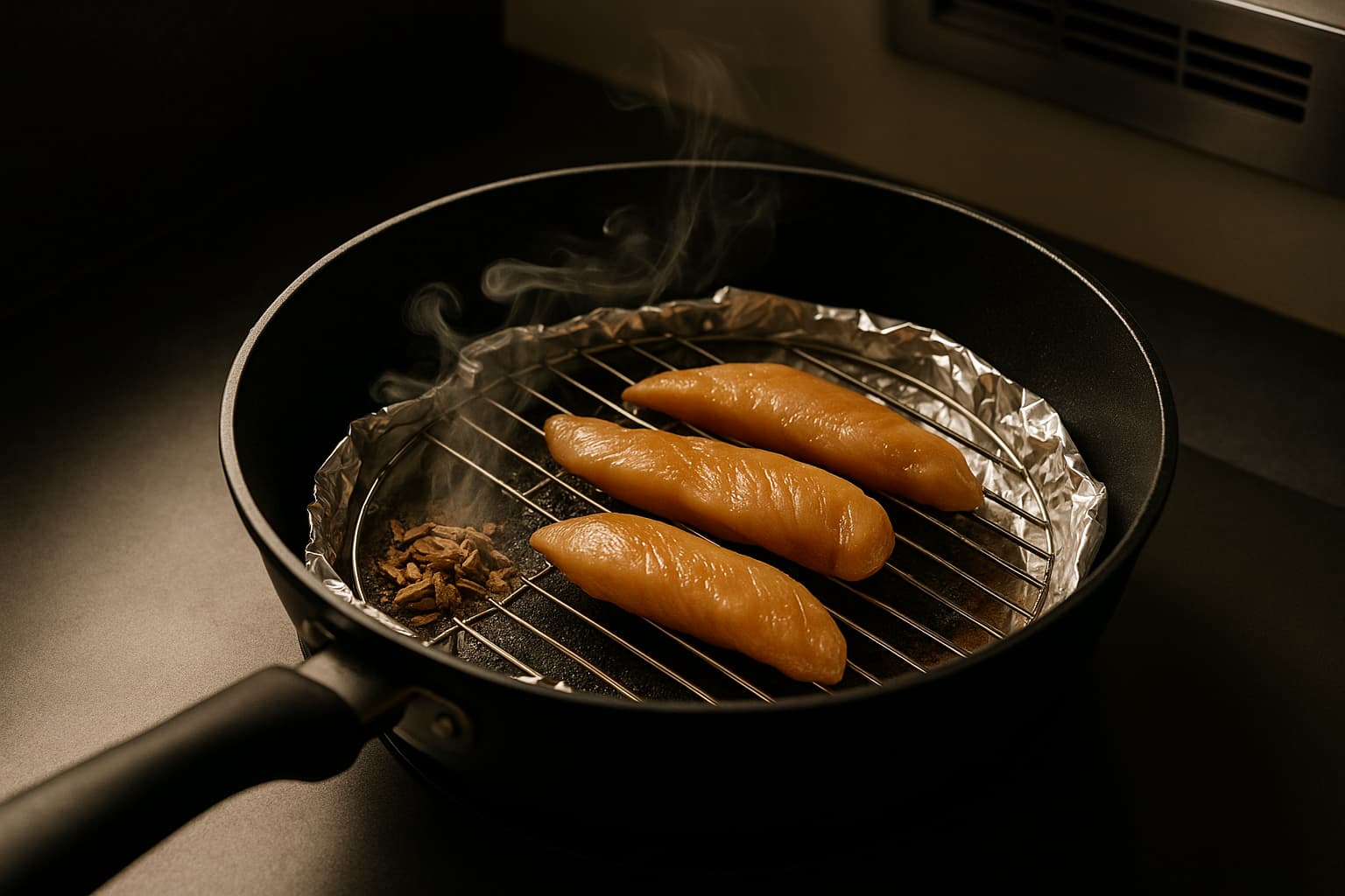 まず、仕込み。筋取りと成形で厚みをそろえ、塩1%+砂糖1%(または塩麹小さじ1/100g)を擦り込む。ここで表面をよく拭き、冷蔵で30〜60分の風乾まで終えておくと、のちの香りが格段にクリアになります。フライパン側は、底にアルミ二重+中央にチップ大さじ2〜3の“山”+足付きの網。蓋裏にもホイルを貼って、後片付けの負担を軽くする——この定型を体に入れておくと、平日に躊躇がなくなります。